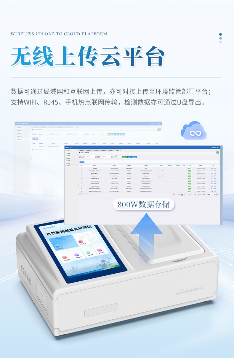 ②配置云監控平臺,檢測結果可直接無線傳至平臺,進行水質長短期分析,輔助管理。