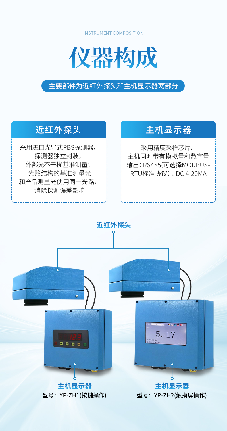 近紅外探頭:采用進(jìn)口光導(dǎo)式PBS探測器,探測器獨(dú)立封裝,外部光不干擾基準(zhǔn)測量;光路結(jié)構(gòu)的基準(zhǔn)測量光和產(chǎn)品測量光使用同一光路,消除探測誤差影響。